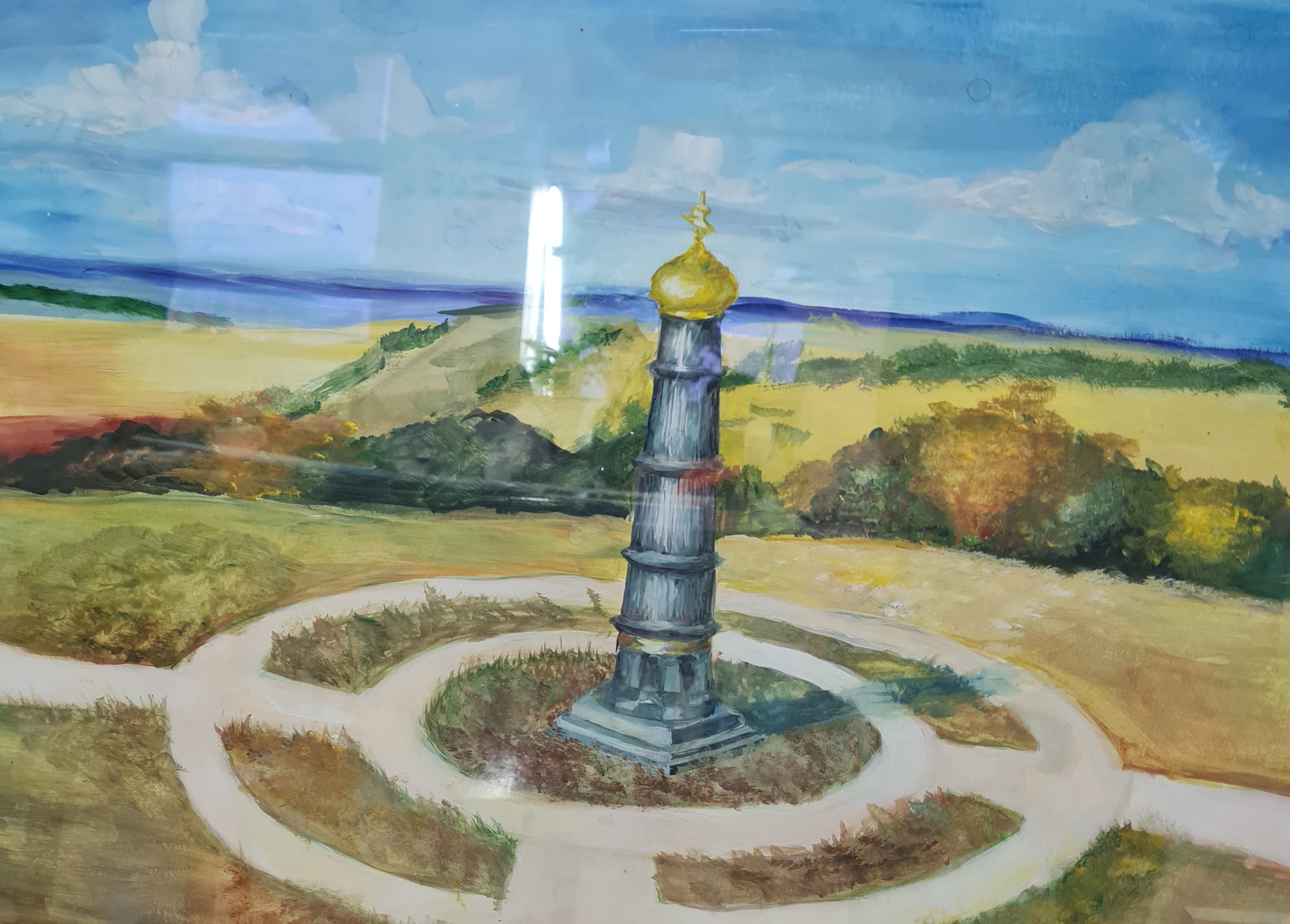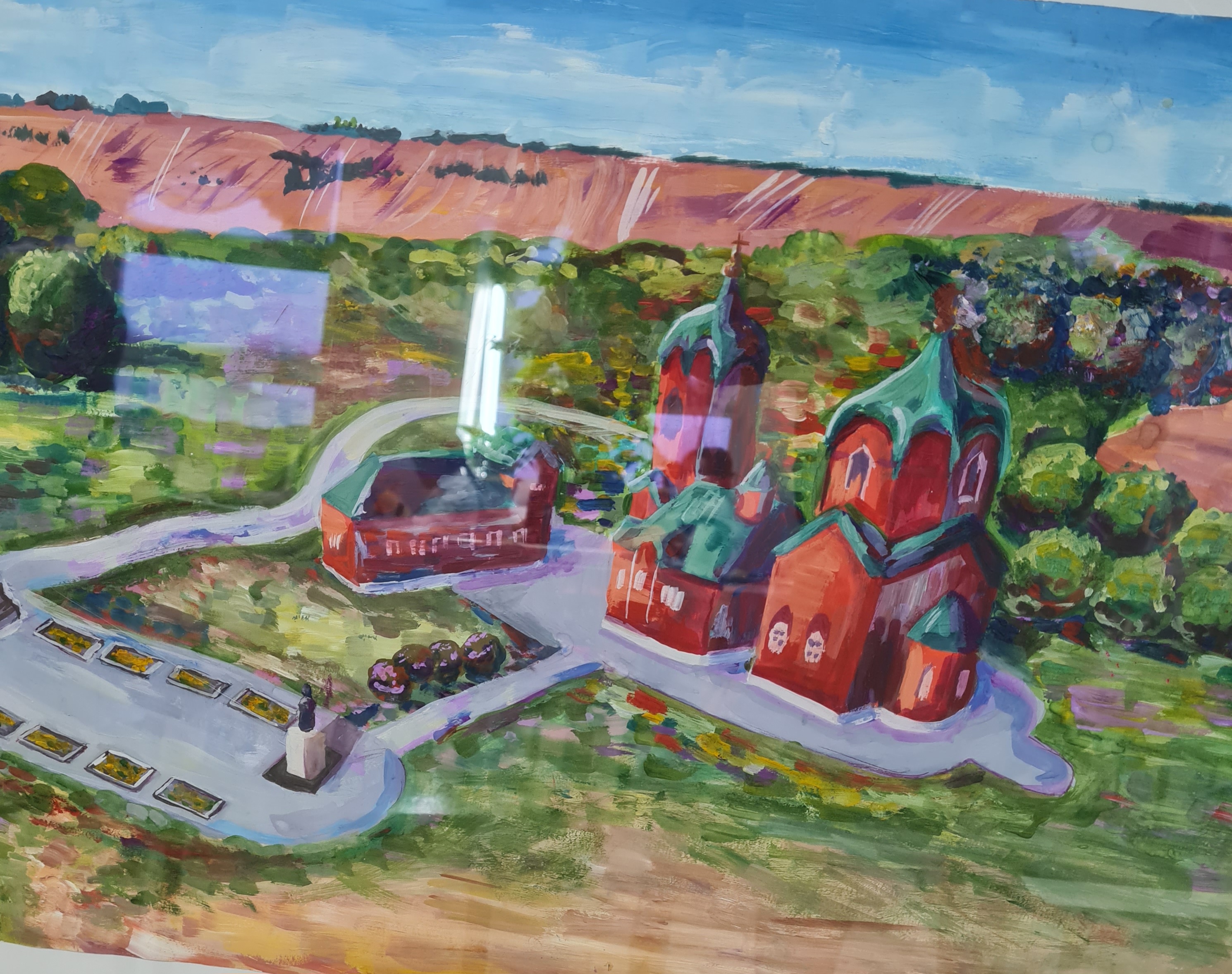 Юные художники подготовили разноплановую выставку. Это и памятники мемориального комплекса, посвященного сражению на Куликовом поле в 1380 году. На рисунках Ярко-красная Церковь Рождества Богородицы,