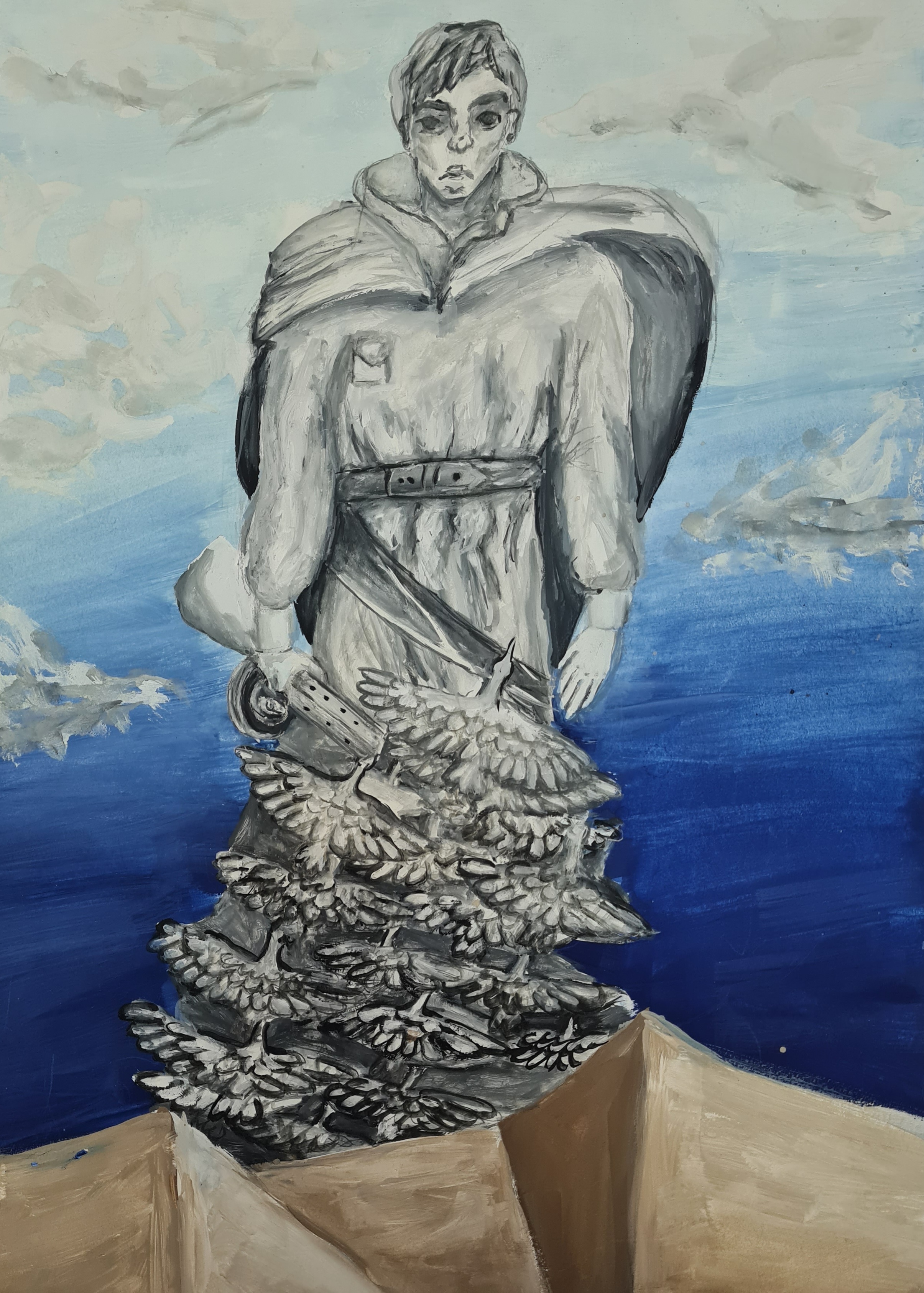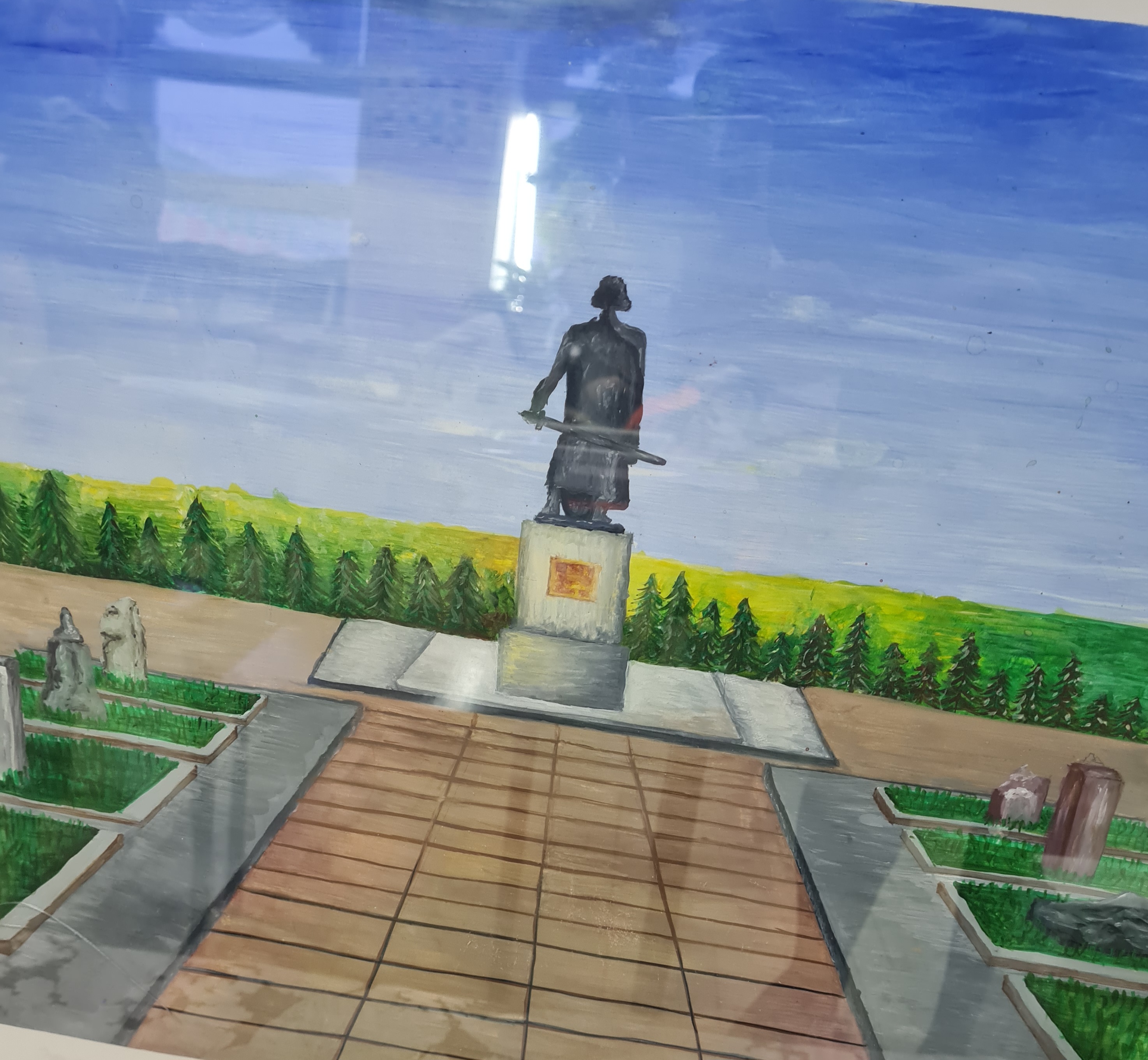 Есть среди работ рисунки, изображающие памятники, посвященные Великой Победе. Знаменитая архитектурная композиция «Хоровод». Она представлена в двух вариантах: среди руин города-героя Сталинграда. Удивительно, как фигуры детей остались не уничтоженными?! И эта же композиция в наши дни. Теперь это памятник детям, жизнь которых унесла страшная война. Ещё один рисунок – современного памятника солдату во Ржеве. Он перекликается с песней «Журавли» Я. Френкеля на слова Р. Гамзатова.