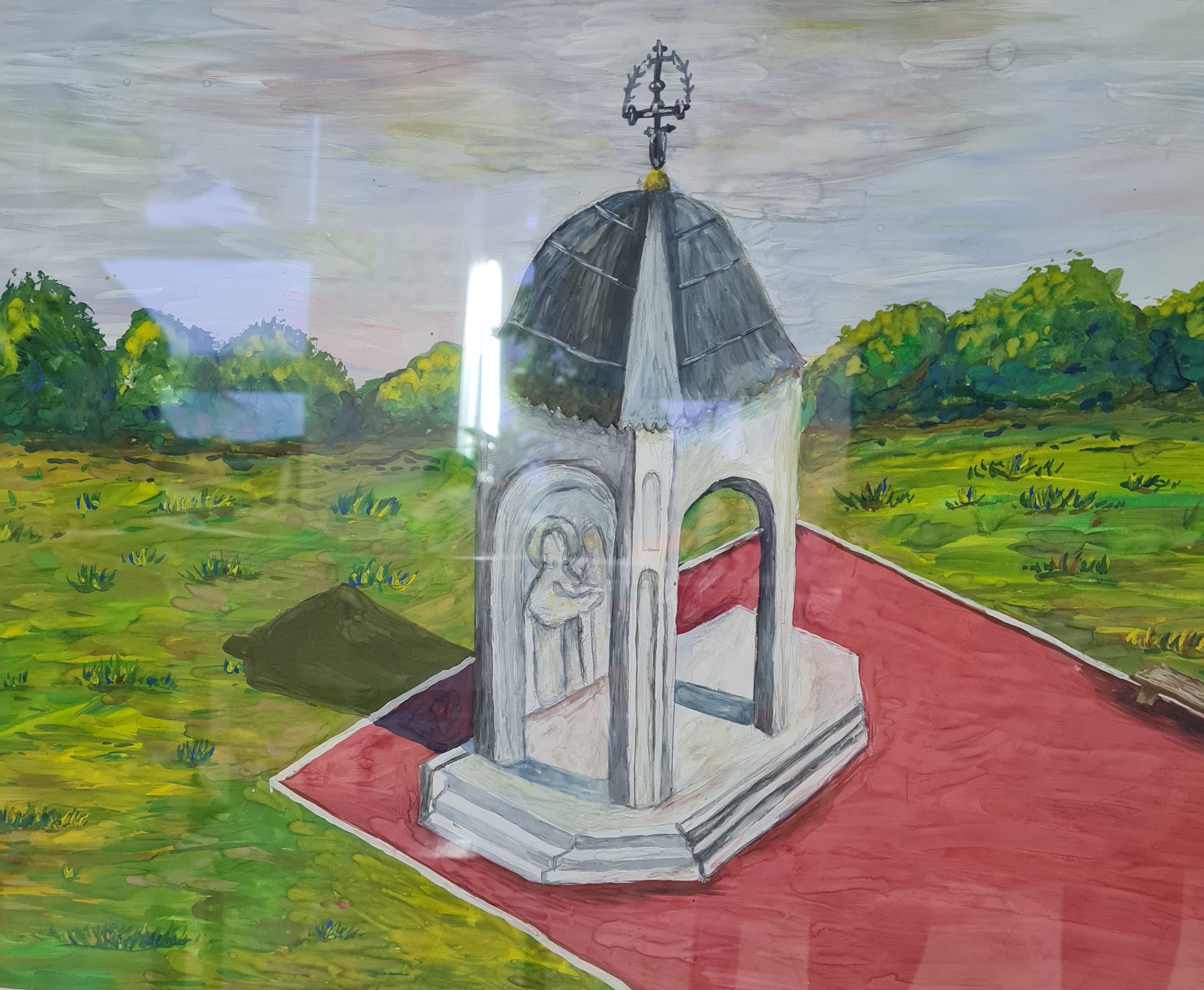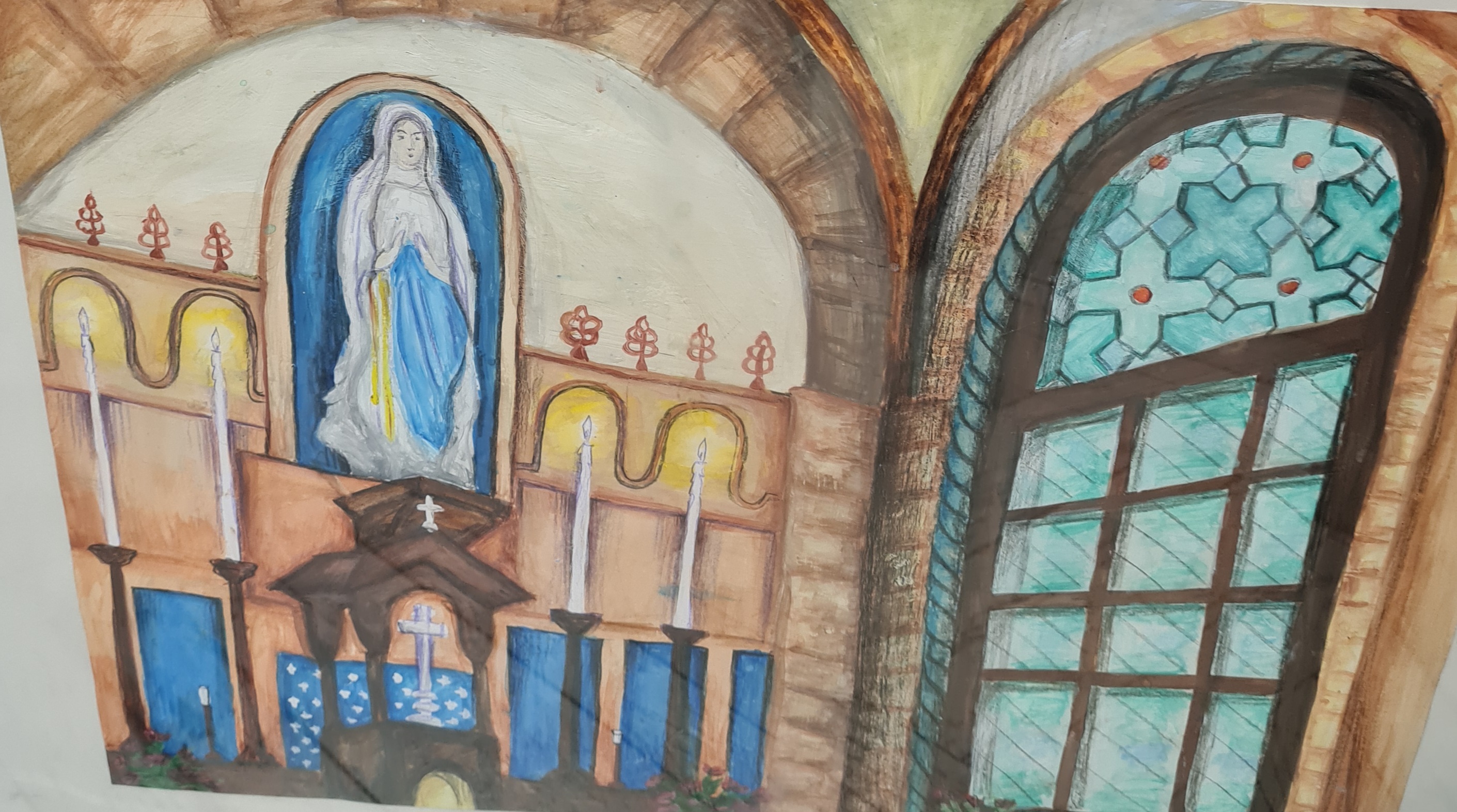 В Великой Отечественной войне в одном строю защищали Родину солдаты всех конфессий! И православные, и мусульмане, и католики, и буддисты! Поэтому среди работ некоторые храмы героического города Ленинграда: Храм Лурдской Божьей матери в Санкт-Петербурге. Это единственный католический храм, который не переставал вести службы и в советский период, Буддийский дацан. На одном из рисунков можно увидеть купол Мечети, а на его фоне шпиль Петропавловской крепости и купол Исаакиевского собора – православных святынь города. Исаакий мало пострадал во время бомбёжек блокадного города - его золотой купол служил ориентиром для фашистов, ведущих обстрелы города.